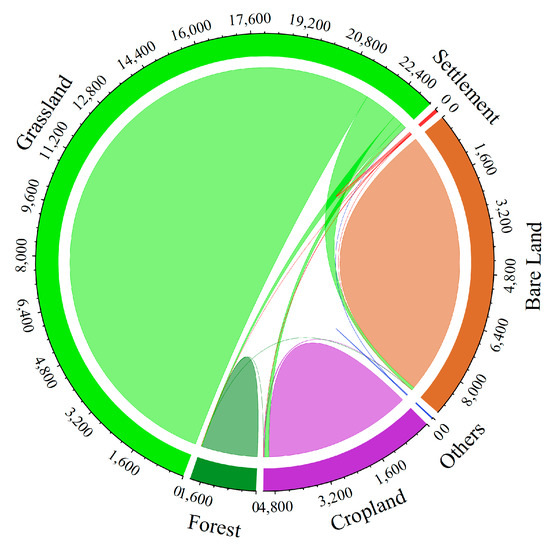 LULC changes in the SRB from 2000 to 2018 (unit: km2). Notes: The arcs represent the area of each LULC category in the SRB during 2000–2018 after land use conversion had occurred. The connecting lines show the conversion relationship among various LULC categories. The color of the connecting line between two LULC categories indicates which LULC type has a higher proportion in the transformation. For example, the connecting line between grassland and bare land is illustrated with the color of grassland, indicating that the area transferred into grassland was larger. The thickness of the connecting line indicates the size of converted area between two LULC types; a thicker line indicates a greater conversion area between two LULC types.