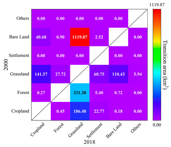 Regarding the five primary LULC types of cropland, forests, grassland, bare land, and settlements in the SRB, grassland and bare land exhibited the most significant variations during 2000–2018. Grassland grew by 1291.32 km2 and bare land declined by 1052.64 km2 (Table A2). Settlements had the highest rate of change, increasing approximately sixfold between 2000 and 2018. In contrast, cropland exhibited the lowest rate of change (−0.53%). Furthermore, the cropland area varied the least among the five main LULC categories in the SRB, decreasing by 27.36 km2.