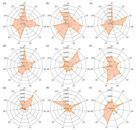 Driving forces behind LULC changes in the SRB during 2000–2018: (a) cropland→grassland; (b) cropland→settlement; (c) forest→grassland; (d) grassland→bare land; (e) grassland→cropland; (f) grassland→settlement; (g) bare land→cropland; (h) bare land→grassland; and (i) other land use conversion types. Notes: The factors in this figure indicate the variation in each factor between 2000 and 2018. The factor codes are as follows: Z1, temperature; Z2, precipitation; Z3, altitude; Z4, population density; Z5, GDP; Z6, GDP per capita; Z7, total water consumption; Z8, surface water supply; Z9, groundwater supply; Z10, distance to the rivers; and Z11, distance to urban and township centers. The meaning of each factor is detailed in Table 2.