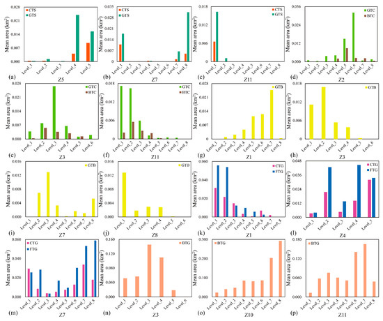 Variations in the influence of driving factors on LULC changes at different levels: (a–c) mean areas of cropland/grassland converted to settlement at different levels of the main driving factors; (d–f) mean areas of grassland/bare land converted to cropland at different levels of the main driving factors; (g–j) mean areas of grassland converted to bare land at different levels of the main driving factors; (k–m) mean areas of cropland/forest converted to grassland at different levels of the main driving factors; (n–p) mean areas of bare land converted to grassland at different levels of the main driving factors. Notes: The levels represent the strata of factors generated by discretization; the discretization methods and the values of factors corresponding to each level are shown in Table A4 in Appendix F. The factor codes are as follows: CTG, cropland→grassland; CTS, cropland→settlement; FTG, forest→grassland; GTB, grassland→bare land; GTC, grassland→cropland; GTS, grassland→settlement; BTC, bare land→cropland; BTG, bare land→grassland; OTS, other land use conversion types; Z1, temperature; Z2, precipitation; Z3, altitude; Z4, population density; Z5, GDP; Z6, GDP per capita; Z7, total water consumption; Z8, surface water supply; Z9, groundwater supply; Z10, distance to the rivers; and Z11, distance to urban and township centers. The meaning of each factor is presented in Table 2.