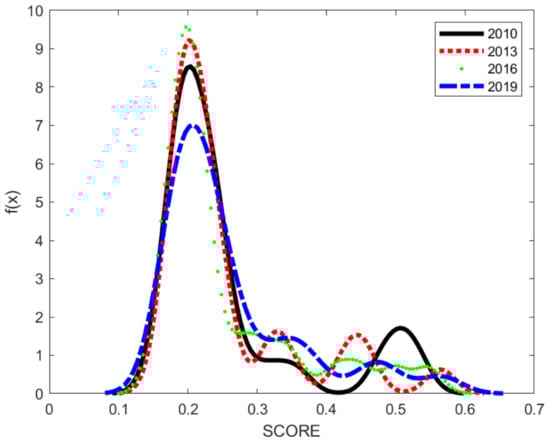 This paper uses nuclear density estimation to analyze the spatiotemporal dynamic changes in green development levels in China’s provinces and cities. Figure 1 shows the nuclear density estimation of the green development level measurement values of all provinces and cities in China from 2010 to 2019. It can be seen from Figure 1 that the central position of the nuclear density function of the green development level of all provinces and cities in the past ten years is relatively stable, basically maintaining around 0.2. From the perspective of distribution, the peak of nuclear density function fluctuates during the ten years. This value reached the maximum value is 2016, and the minimum value is 2019, indicating that the gap between the green development levels of all provinces and cities has been reduced. From the perspective of distribution extensibility, the nuclear density curve of green development level in the past ten years presents a right-tailed situation, and the right-tailed part gradually tends to be smooth and trends to the middle value, which shows that the distribution of green development level in all provinces and cities is developing in the direction of equilibrium and unification. In terms of the number of peaks, the number of peaks of the nuclear density function increases first and then decreases, indicating that the multi-polar differentiation of the green development level of all provinces and cities has improved, and the main and side peaks coexist, with the main peak high and the side peak low, indicating that there may be gradient development.