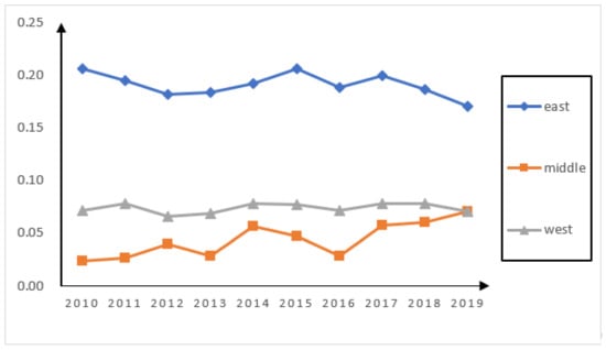 As for the intra-regional Gini coefficient, it can be seen from Figure 2 that the variation trends of intra-regional differences in the eastern, central, and western regions are relatively stable. In general, the difference within the eastern region is the largest and shows a gradual downward trend. The difference in the central region is the smallest and shows a gradual upward trend. The western region is in a stable state. Specifically, although the difference in the eastern region is decreasing year by year, it is relatively large compared with the other two regions, and it is higher than the other two regions in the past ten years. Although the difference in the central region increases year by year, it is still smaller than that in the other two regions, and it is at the bottom in the ten years. The difference in the western region has little change and basically remains at a horizontal line.
