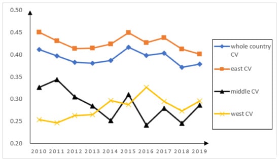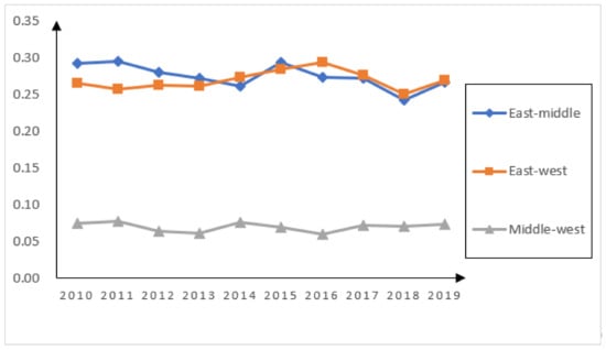 The differences between regions are shown in Figure 3, showing that the differences between the eastern-middle regions and eastern-western regions are large, while the differences between the middle-western regions are small. More specifically, the eastern-middle regions showed a trend of first falling and then rising, and then falling and rising again. On the whole, it is still declining. In 2010–2013 and 2015, its Gini coefficient was the largest. The eastern-western regions showed a trend of first rising, then falling, and then rising, with the highest value in 2016. In 2014 and from 2016 to 2019, its Gini coefficient was the largest. The middle-western regions show a relatively stable trend, and their Gini coefficients are the smallest among regions in the past ten years, always at the bottom.