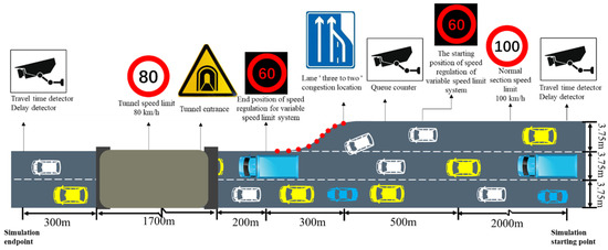 Simulation scenario 1 is a common road and traffic scenario near the entrance of a high-speed tunnel caused by road design issues [30]. The content of the scenario is shown in Figure 4. The total length of the simulated section is 5000 m, the normal section comprises three one-way lanes, the lane width is 3.75 m, and the speed limit is 100 km/h. The number of lanes decreases 500 m upstream of the tunnel entrance, the bottleneck reduces traffic to two one-way lanes, and the speed limit is 80 km/h. The scenario is set at the location where the number of lanes decreases and congestion occurs. The starting position of the speed adjustment of the VSL system is set at 500 m upstream of the congested section. The end position of the speed adjustment of the VSL system is set at 200 m before the tunnel entrance. Due to the large traffic volume, high dispersion of vehicle speed, and fixed bottleneck points, there are frequent accidents and serious congestion at the tunnel entrance in practice. It is urgent to apply a VSL system to realize active risk prevention and traffic control. Therefore, it is of practical significance to study whether the VSL system would be effective in this environment to alleviate the traffic problems.