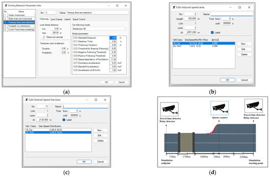 The implementation of the VSL system in VISSIM can cause changes in vehicle speed in different sections by setting the desired speed and delimiting the decision range by setting the decision starting and ending points. In the same decision interval, different types of vehicles can have different expected speed distributions. In the scenario where the number of lanes on the road decreases, causing congestion at the bottleneck, and driving speeds are low, to buffer the congestion and reduce the dispersion of vehicle speed, a VSL is implemented 500 m upstream of the congestion area in the simulation. Under the condition that drivers fully obey the VSL, the expected speed of passenger cars and trucks is set according to different speed limits. The parameter-setting method is shown in Figure 6c. Three types of detectors are set up in the simulation scenario: ① travel time detectors at the beginning and end sections, ② delay detectors at the beginning and end sections, and ③ queuing counters 200 m upstream of the congestion area. Detailed information on detector placement is shown in Figure 6d.