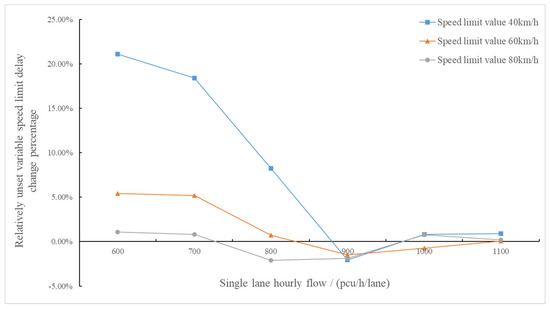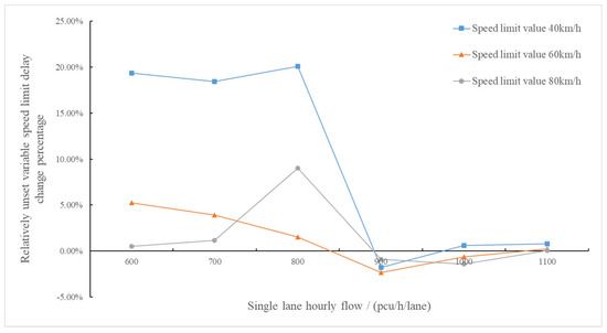 Figure 8 illustrates that the VSL system plays different roles under different flow conditions, which also proves that different flow rates need different speed limits. To find reasonable speed limits under different flow rates, it is necessary to study the delay changes with different speed limits. Based on a simulation scheme with a speed limit of 60 km/h in scenario 1, two simulation experiments with speed limits of 40 and 80 km/h were conducted. In each simulation experiment, six groups of comparison experiments with different flow conditions were conducted. The percentage of delay change in scenario 1 compared with the system without a VSL is shown in Figure 9.