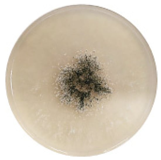 The cellulolytic activity of T. viride was assessed on a culture medium with a 1% addition of carboxymethyl cellulose (CMC; Sigma-Aldrich, St. Louis, MI, USA). The experiment was prepared in accordance with the previously described methodology. Conical flasks were inoculated with T. viride culture discs and then incubated for 7 days at 25, 30, and 35 °C, respectively. After one week, 0.1 mL of the culture solution was withdrawn from each flask and transferred to a Petri dish with solidified medium. The Petri dishes were incubated at 25, 30, and 35 °C for the next 7 days, and then the activity index (IA) was determined. A 1% aqueous solution of Congo red (Sigma-Aldrich St. Louis, MI, USA) was poured into the plates and left for 15 min. Then, the excess solution was poured off, and 1M NaCl solution was introduced to the dishes. Positive reaction was indicated by the formation of a clear zone (halo) around the colony. The decolorization was carried out over a period of 20 min. The cellulolytic activity index was determined by comparing the hydrolysis zone visible in the form of brightening around the colony (A) to the diameter of the colony (B), according to the following formula: