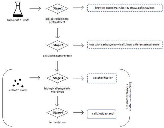 The lignocellulosic biomass was subjected to physical and mechanical pretreatment. In a laboratory mill, 200 g of the substrate was ground to 1–2 mm particle size. Then, thermal treatment was applied. The substrate was placed in 2 L of water, boiled for about 30 min, cooled to 25 °C. and poured into a 3L polyethylene container. Ten discs were cut from a 7-day T. viride culture (5 mm in diameter). The experiment was prepared in three containers to obtain enough solution for the fermentation process. The containers were kept in a thermostat at 25 °C (optimum temperature for T. viride cellulolytic enzymes) for 21 days and then sterilized at approx. 100 °C. The contents of the containers were filtered through a mesh filter, separating the solid from the liquid fraction used for ethanol fermentation. After filtration, 3.4 L of solution were obtained; therefore, fermentation of monomeric sugars present in the hydrolysates was carried out in two fermentation containers with a capacity of 3 L, with the participation of Saccharomyces cerevisiae distillery yeast (Turbo Pure Yeast, MAXX Johnnie Cotton). The pH was set at 5.0 using 10 N sulfuric acid (cz.d.a, Chempur). The containers were placed in a thermostat at 30 °C (optimum temperature for S. cerevisiae activity) and incubated for 14 days. The wort was distilled at a temperature of 78.32 °C in an apparatus equipped with a heating mantle with a power regulator, a dephlegmator with a receiver, a cooler, and a thermometer that allowed for control of the temperature of the vapors. The ethanol content of the distillate was determined with an alcohol meter and is given as a percentage by volume (v/v). The experimental flow chart for all stages is shown in Figure 2.