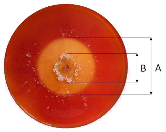 Scheme for determining the index activity (A—diameter of clear zone, B—diameter of fungal colony).