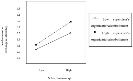 The results of these models suggests that the control variable did not significantly influence LMX (F = 1.1316, p = 0.359). Subordinate moqi positively affected LMX (β = 0.509, p < 0.01) and supervisor’s organizational embodiment also had a positive impact on LMX (β = 0.216, p < 0.01). In Model 4, when subordinate moqi, supervisor’s organizational embodiment, and the interaction term were added to the model, the moderator significantly impacted LMX (β = 0.130, p < 0.01). Furthermore, the moderating effect of the interaction term strengthened the positive correlation between subordinate moqi and LMX, supporting Hypothesis 3. As shown in Figure 2, when there is a higher level of perceived supervisor’s organizational embodiment, subordinate moqi has a more decisive role in promoting LMX.