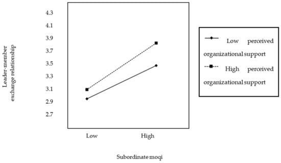Conversely, with a low level of organizational support, employees do not experience a sense of community and cohesion. As a result, employees lack the obligation to assist the organization in achieving its objectives [8]. Even those who share certain moqi with their supervisors would find it challenging to work beyond their responsibilities for an organization that cannot fulfill their socio-emotional needs. Thus, work becomes a fulfillment of duties rather than a mutual achievement with the organization, severely threatening the quality of the exchange relationship between supervisors and followers. Therefore, the researchers of this study argue that perceived organizational support could regulate the positive effect of subordinate moqi on the leader–member exchange relationship. Hence, it is hypothesized that: