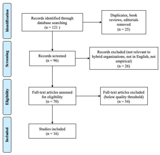 Our paper is organized as follows. After outlining the methods we have employed in our systematic review, including the keywords and search strategy, the search terms we employed, and explaining and justifying our selection and exclusion criteria, we present our findings. Our findings are based upon our analysis and synthesis of the 16 papers that fell within the scope of our review. We show how the literature has encompassed a variety of tensions and solutions—both endogenous and exogenous—in diverse contexts and market conditions. We then explain how solutions can be grouped into two categories: (1) to form a new logic; or (2) to decouple pre-existing logics. In conclusion, we explain how hybrid organizations can be understood to have diverse impacts at multiple levels—the micro, meso, and macro levels—of their institutional contexts. First, however, we turn attention to our methodology.