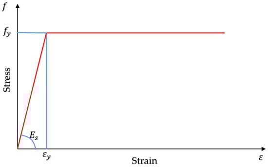 The yield strength of steel () is considered as 345 MPa. Concrete slab shear connectors and steel reinforcing bars were subjected to kinematic bilinear stress–strain relationships with full plastic stress. The stress–strain relationship for steel is shown in Figure 1.
