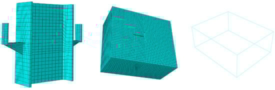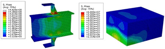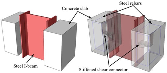 Figure 7 illustrates a typical finite element mesh used to simulate the test specimen’s geometry. The steel beam, shear connector, and concrete slab were all modeled using the eight-node solid element (C3D8R), as was the linear two-node truss element (T3D2). At each node in the global coordinate, there are two nodes and three translational degrees of freedom (translation in the x, y, and z dimensions).