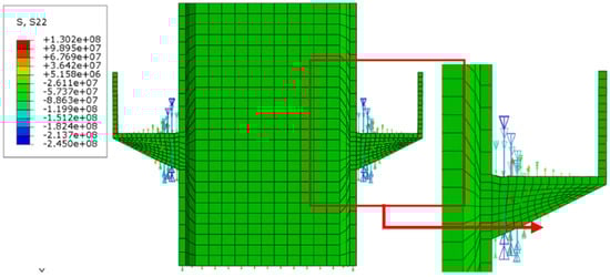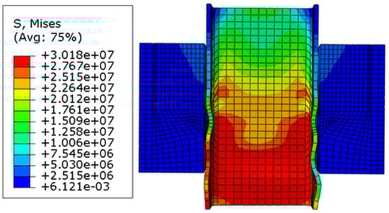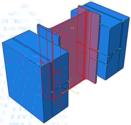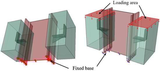 The finite element analysis was based on the same loading as the test specimen. On the concrete slab, a vertical velocity loading was used to put pressure on it. The weight is being transferred downwards. In the nonlinear stage, velocity-controlled loading is more stable than force-controlled loading. A quick loss in load-carrying capacity in brittle materials like concrete results in a significant rise in kinetic energy, which is particularly critical for these materials. To obtain a stable and reliable solution, the load application rate should be carefully designated and sufficiently slow to prevent a dramatic increase in the kinematic energy. Therefore, a uniform displacement is slowly applied to the surface of the concrete slab. The optimum loading rate was set to be 0.02 mm/s which has been used by other researchers [,,,,,] and also by using the trial and error approach of different loading rates. According to Figure 8, all I-beam sections were restrained against displacement in all three directions to mimic boundary conditions for specimens.