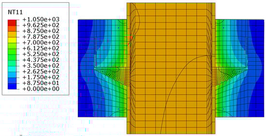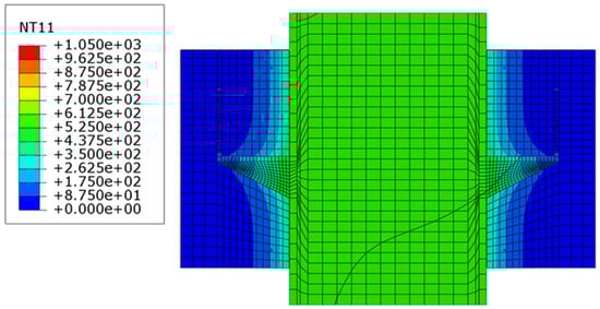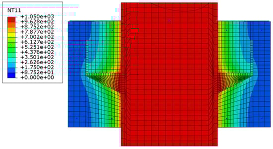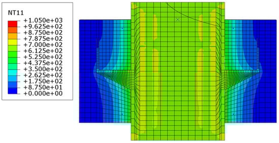 Temperature load under the coupled temp-displacement step was used to apply heat with an amplitude of heat according to the standard fire curve []. Figure 9 shows the area of applying heat where the heat is applied in a laboratory test.