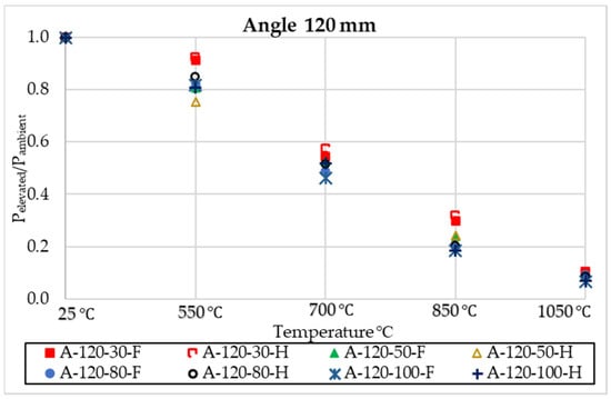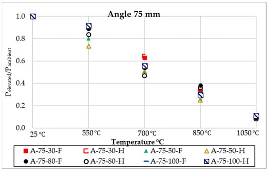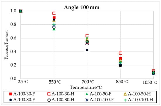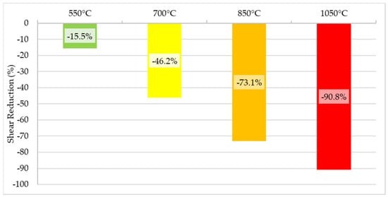 The width of the shear connector in the stiffened shear connector and ordinary shear connector has a vital role in enhancing the shear strength of the shear connector. Increasing the width of the steel angle profile bearing area of force at the root of the shear connector rises, as mentioned in the previous section, by increasing the area the pressure drops that resulted in bearing higher forces. Moreover, using a longer width of angle profile enhanced the welding line where the shear connector was attached to the steel girders, resulting in more welding line and more fixity of the shear connector against lateral forces. Figure 26 demonstrates the shear enhancement in terms of increasing the width. The stiffened shear connector at ambient temperatures behaves much better and safer compared with the existing C-shaped shear connector, and the shear strength of the stiffened shear connector was higher by 126%, compared with the same geometry of the ordinary C-shaped shear connector. Therefore, its behavior in the event of a fire was investigated. According to the literature review and material properties, elevated temperature has a destructive effect on the strength of materials. The shear strength of the stiffened shear connector at elevated temperature dropped substantially, but its shear strength at a 700–850 °C temperature was equal to that of the ordinary C-shaped shear connector at ambient temperatures with the same geometry. Thus, the stiffened shear connector is extremely safer in ambient and especially elevated temperatures. The shear reduction of shear strength at elevated temperatures could reach up to an average of 91% at a temperature of 1050 °C. Figure 27 shows the average shear reduction at different levels of elevated temperatures.