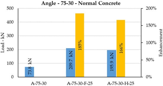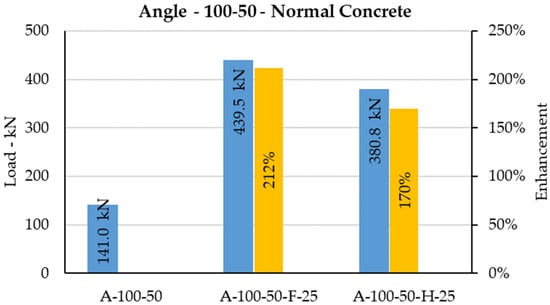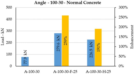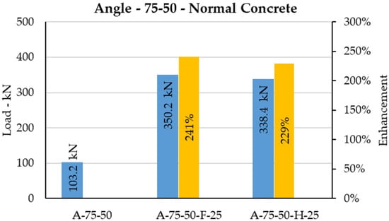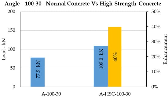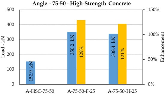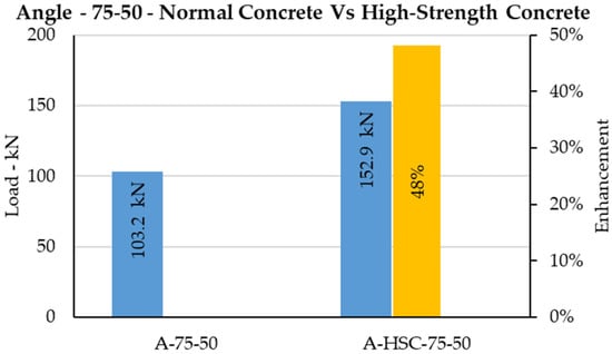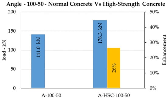 The C-shaped angle shear connector has been investigated, and its behavior embedded to normal concrete and high-strength concrete has been studied [,,,]. Using high-strength concrete instead of using normal concrete enhanced the shear capacity of the typical angle shear connector by 38% on average, as shown in Figure 28, Figure 29, Figure 30 and Figure 31. Thus, high strength concrete with grade 80 MPa [,,] can only increase the capacity by 38% on average whilst casting high-strength concrete is challenging and costly.