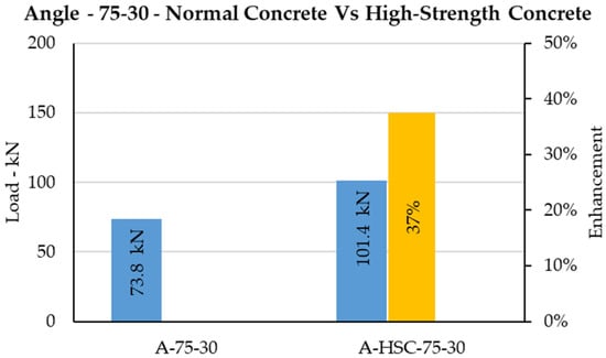 Strength increment of angle 75–30 shear connector in normal vs. high-strength concrete.