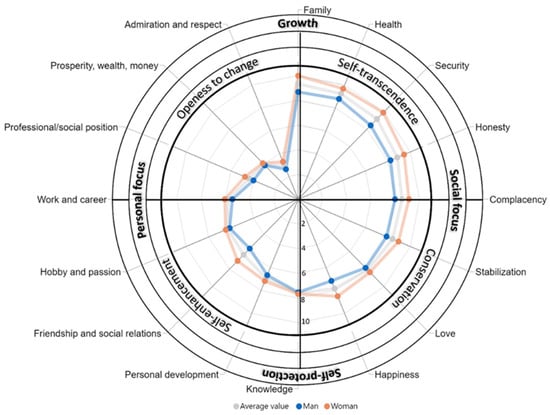 Previous research on values in human life proves that they are strictly dependent on the age of the respondent and change over time [55]. People’s value systems differ depending on the country and cultural group they come from [51,56]. This diversity results from different historical and contextual circumstances, including different levels of political and economic development in the surveyed societies [57]. Interestingly, there is also a very strong differentiation in the priorities of women’s and men’s values [58].