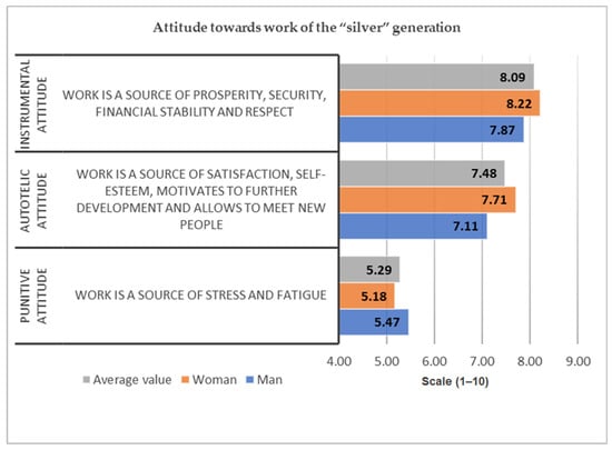 To examine the attitude towards work of the representatives of the “silver” generation, respondents were asked to evaluate three statements formulated according to the assumptions of the value theory that work brings to an individual [59] and to assign each of them scores on a scale of 1 to 10, where 1 represents the least significant values and 10 the most significant. These ratings are presented in Figure 4 as an arithmetic average of the responses obtained. According to the conducted research, the statement that best characterizes the respondents’ attitude to work is: work is a source of prosperity, security, financial stability, and respect (8.09). At a slightly lower level (7.48) is the statement: work is a source of satisfaction, self-esteem, and motivation. It should be noted that in both cases, the ratings given by women differed from the ratings given by men (Figure 4). Women gave higher marks than men by 0.35 and 0.6 points, respectively. The lowest-rated statement by the respondents was: work is a source of stress and fatigue (5.29). Moreover, in this case, the scores awarded by women differed from those of men (they were lower by 0.29 points).