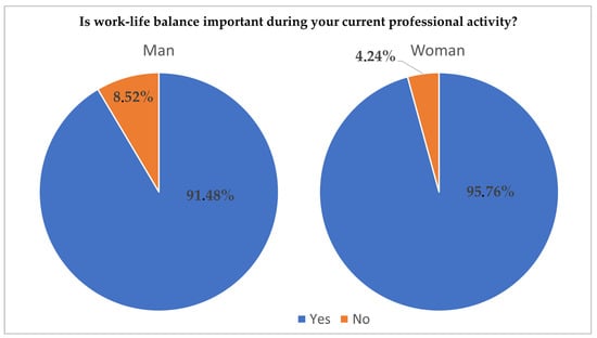 In order to detail the characteristics presented above and determine the place of work in the lives of representatives of the “silver” generation, respondents were also asked to answer two questions about the balance between work and private life. In both cases, the responses given by women differed from those given by men. The ability to maintain a balance between private and professional life is important for 96% of women and 91% of men (Figure 5).