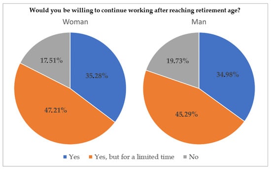 A fundamental issue from the point of view of the functioning of the labor market is to determine whether employees of the “silver” generation want to work after reaching retirement age (Figure 7). According to the conducted research, the vast majority of respondents (82% of women and 80% of men) are willing to continue working after reaching retirement age but would prefer a limited-time job (47% of women and 45% of men, respectively). Factors that constitute the greatest motivation to continue working after reaching retirement age (Table 6) included a good work atmosphere (8.72), high salary (8.58), stable employment conditions (8.54), and low stress level (8.39). The factors that received the lowest scores were foreign trips, internships and trainings (5.42), and the possibility of promotion and development (6.71). Women scored higher than men by about 0.6 points.