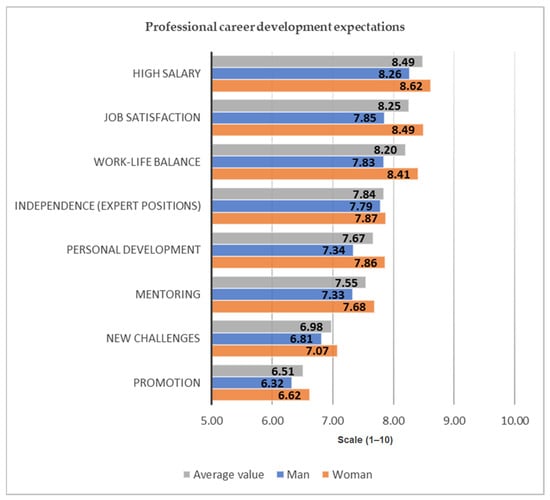 The studies conducted so far on the differentiation of professional career development depending on gender prove that there are significant differences between men and women in this aspect [90,91,92,93]. According to these assumptions, a research hypothesis (H4) can be formulated, which states that