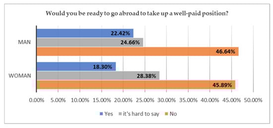 Interestingly, 31% of men believe that work is just as important as family and friends, while as many as 65% of them declared that family and friends are more important to them than work. In the case of women, 48% of them believe that work is just as important as family and friends, and almost 50% declared that family and friends are more important to them than work (Figure 6). This is probably due to the significantly inferior position of women in today’s labor market, especially those of mature age. Women tend to be paid less and have more difficult access to top positions. Women are at much greater risk of dropping out of the labor market than men due to the collision of work and family life. The percentage of women’s employment clearly decreases with the arrival of more children. Generally, these women return to the labor market; however, the break in their professional activity usually lasts up to a dozen years, which makes women appreciate work and the opportunity for professional development more than men. There is also the issue of stereotypes and social and media pressure that a woman’s role is to run the home and take care of children and elderly family members, and work and career is a secondary issue that should not interfere with these responsibilities [100]. As can be seen, this kind of tendency is not evident among men.