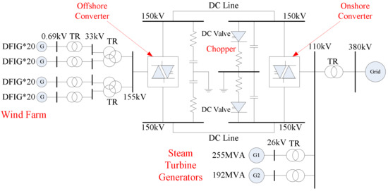 The system studied is shown in Figure 1, which is modified with reference to the demonstration system in [19,20]. A VSC-HVDC transmission system, of which the capacity is 400 MW, is designed to transmit the power of an offshore wind farm to the onshore grid. The wind farm consists of 80 wind turbines. Each wind turbine is equipped with the DFIG units and has a nominal active power of 5 MW. If all the wind turbine generator units are operational, the wind farm can generate up to 400 MW of power in total. The AC bus voltages of the sending and receiving ends are 155 kV and 110 kV, respectively. At the receiving end of AC bus, there are two traditional steam turbine generator units, G1 and G2. The G1 is a 255 MVA unit, and the G2 is a 192 MVA unit.
