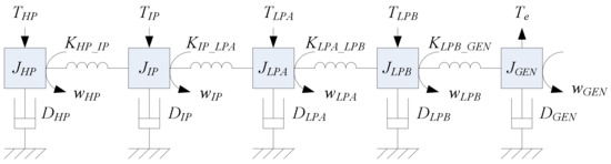 For studying the behaviors of the turbine generator unit, the built-in six-order model is adopted for modeling the synchronous generator. And the IEEE Type1 AVR (Automatic Voltage Regulator) is adopted for the voltage regulation. However, for the turbine-and-generator mechanism, the two-mass model is adopted in the built-in synchronous generator model, which is not enough for the studies. Thus, the turbine-and-generator mechanism is modified to the multi-mass model. For the G1 unit, which is equipped with a high-pressure turbine (HP), an intermediate pressure turbine (IP), and two low pressure turbines (LPA and LPB) in additional to the generator rotor (GEN), the five-mass model is used. For the G2 unit, which is equipped with HP, IP, LP, and GEN, the four-mass model is used. The lumped mass-damping-spring model of the multi-mass model is shown in Figure 2, of which the model parameters are listed in Table 1. Based on the model, the dynamic equations can be obtained as the following. It must be noted that will be the minus electromagnetic torque () for the generator rotor section.