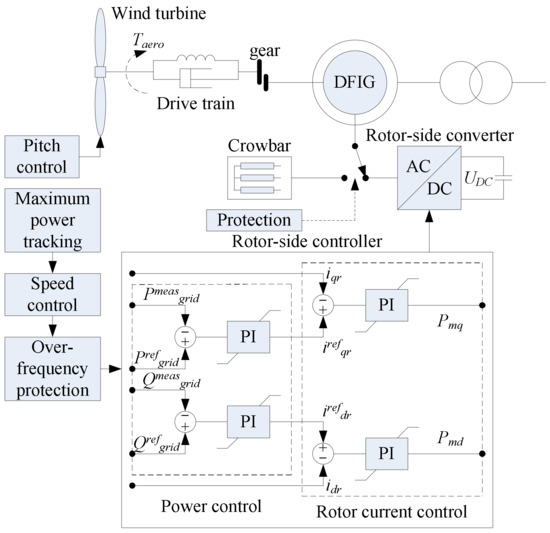 For the power controller part, there is an outer loop to regulate the active and reactive power, and an inner loop to regulate the active and reactive current. By regulating the q- and d-axis rotor currents, respectively, the active and reactive power can be controlled. The active power reference is obtained from the maximum power tracking algorithm, while the reactive power reference is obtained from the power factor controller.