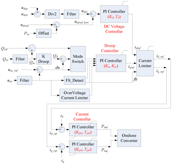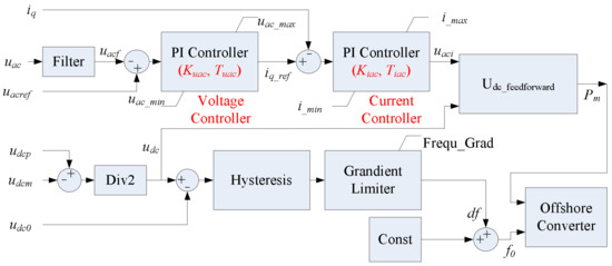 The built-in generic onshore controller is shown in Figure 4. The onshore converter is a voltage source converter. It can control the active current as well as the reactive current. The control objective of the active current is the DC voltage, which is done by a PI controller with proportional gain Kd and integral time constant Td. The control objective of the reactive current can be selected by the mode switch. The mode 1 (i.e., the control objective is the voltage via a droop) is selected here in the studies. The PI controller with proportional gain Ku, and integral constant Kiu is used to regulate the reactive current. The reference currents are given by the following equations.