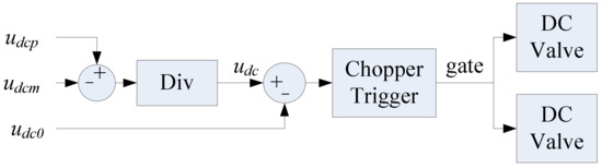 To protect the converter, the system is equipped with a chopper-controlled resistor on the onshore side. The control architecture is shown in Figure 5. When there is a fault taking place on the onshore grid, the DC circuit will be charged. When the DC voltage exceeds a certain limit, the chopper controller will send gate signals to trigger the chopper DC valves to limit the voltage to an appropriate value.
