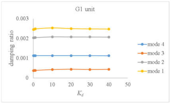 Firstly, modal analysis is made. For studying the effect of Kd on SSTI, Kd is varied from 0.1 to 40 for the modal analysis. The result for the G1 unit is shown in Figure 7. The effect is small for the modes 1, 2 and 3, while the mode 4 is completely unaffected. The most affected one is the mode 3, of which the damping ratio has a 17% change (varying from 0.000377 to 0.000442). The trend of influence is that the larger the Kd, the greater the damping ratio.