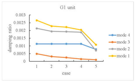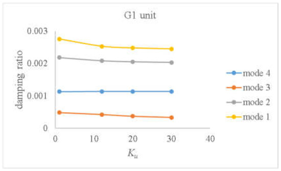 For studying the effect of Ku on SSTI, Ku is varied from 1 to 30 for the modal analysis. The result for the G1 unit is shown in Figure 8. It can be seen that the effect is significant for the modes 1, 2 and 3, while the mode 4 is completely unaffected. The damping ratio of mode 1, 2 and 3, respectively, has a 13%, 8%, and 46% change (respectively varying from 0.002757 to 0.002451, from 0.002187 to 0.00203, and from 0.000489 to 0.000386). The trend of influence is that the larger the Ku, the smaller the damping ratio.