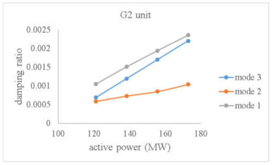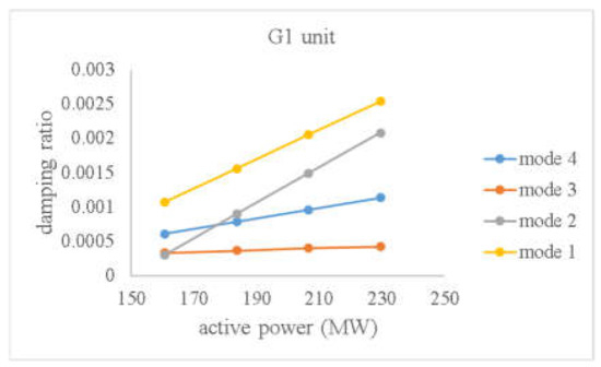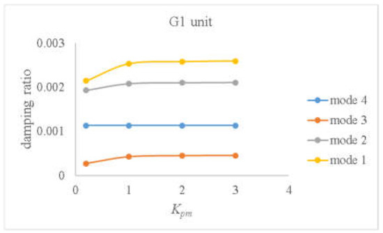 For studying the effect of Kpm on SSTI, Kpm is varied from 0.2 to 3 for the modal analysis. The result for the G1 unit is shown in Figure 9. The effect is also significant for the modes 1, 2 and 3, while the mode 4 is completely unaffected. The damping ratio of mode 1, 2 and 3, respectively, has a 20%, 9%, and 65% change (respectively varying from 0.002148 to 0.002595, from 0.001934 to 0.002111, and from 0.000276 to 0.000456). The trend of influence is that the larger the Kpm, the greater the damping ratio.