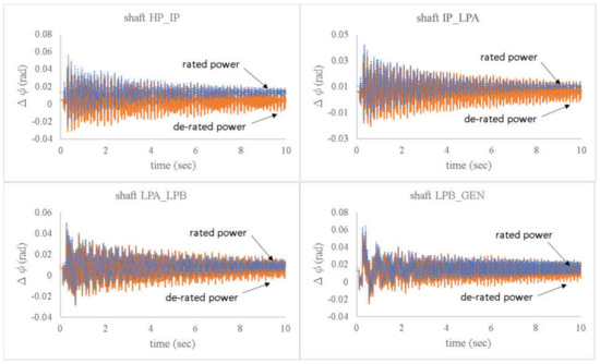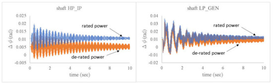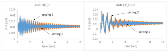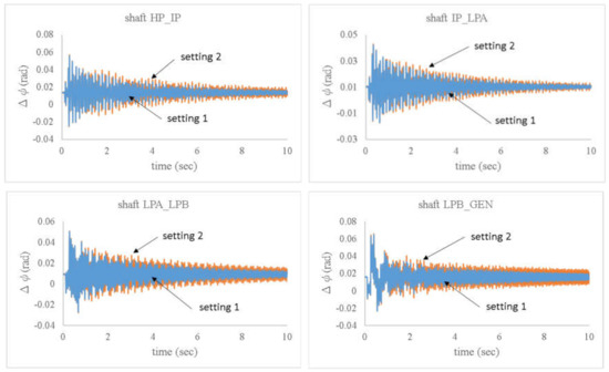 For the two settings, the damping ratio of modes 1, 2, and 3, respectively, has a 16%, 10% and 55% change (respectively changing from 0.002654 to 0.002284, from 0.002136 to 0.001943 and from 0.000496 to 0.00032). In Figure 10, it shows the torsional angles of various turbine shafts for the G1 unit for the two settings. It can be seen obviously that the setting 1 is better than the setting 2. For the setting 1, each shaft exhibits slighter vibration than that for the setting 2. The shaft LPB_GEN is found to present the most significant change in vibration. This is due to that the vibration at this shaft is dominated by the mode 3.