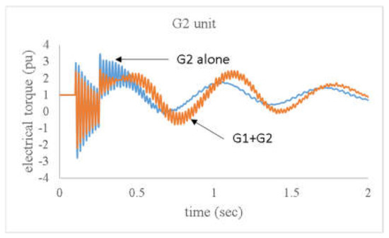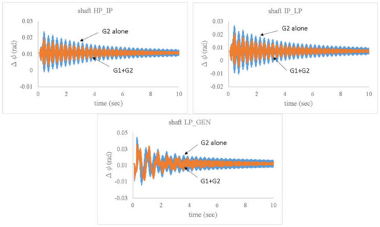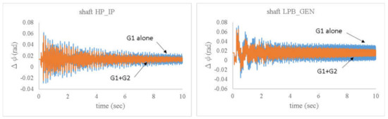 For the transient simulation, the responses subjecting to the same events as previous are studied. In Figure 16, it shows the electrical torque of G2 for the different machine configurations. It can be seen that for the G2 alone configuration, the electrical torque of G2 presents larger disturbance during the fault and fault clearance. The larger disturbance, of course, would excite larger vibrations on shafts. In Figure 17, it shows the torsional responses of various shafts. It can be seen that every shaft presents severer vibrations for the G2 alone configuration. For the shaft HP_IP and the shaft IP_LP, the difference in peak-to-peak value of initial vibrations can reach up to 1.5 times. By observing the shape of these vibrations, it can be found that although the vibration amplitude becomes larger, the attenuation rate does not change. This means that the increase in electrical torque disturbance is the main cause of the greater vibrations, instead of the change in damping ratio of torsional modes.