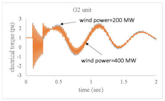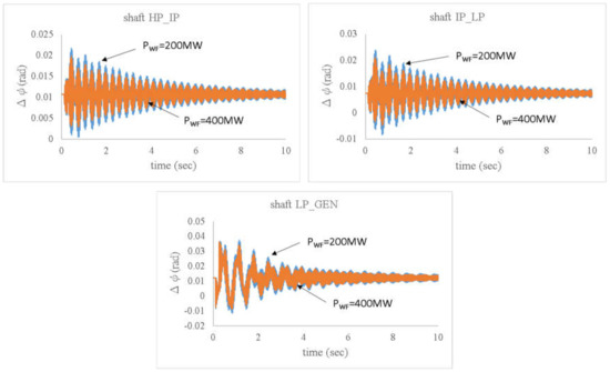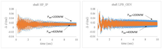 For the transient simulations, in Figure 19, the electrical torque of G2 is shown when integrating different wind farm power. It can be observed that there is a slight difference between the two situations. For the integration of 200 MW of wind farm power, the electrical torque disturbance caused by the fault and fault clearing is slightly greater than that for the integration of 400 MW of wind farm power. However, although the difference in electrical torque disturbance is small, the difference in shafts vibrations caused by it is obvious. In Figure 20, it shows the shafts’ torsional responses for integration of different wind farm power. It can be seen obviously that the torsional vibrations for the integration of 200 MW of wind farm power are severer. In the case of shaft HP_IP, the difference in peak-to-peak value of initial vibrations is about 1.3 times.