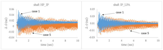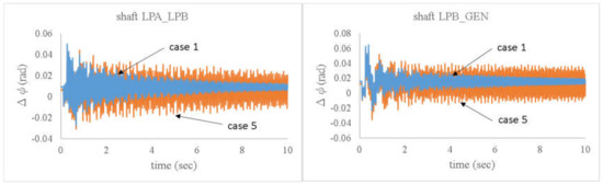 Due to the characteristics of superposition for various effects, the torsional responses will be significantly different under the good and the bad situations. In Figure 24, it shows the torsional responses of various shafts for the cases 1 and 5. It can be seen from the figures that the initial vibrations of each shaft differ by about 10%. Then, the difference in vibration magnitude gradually increases. Finally, the difference reaches up to six times or so.
