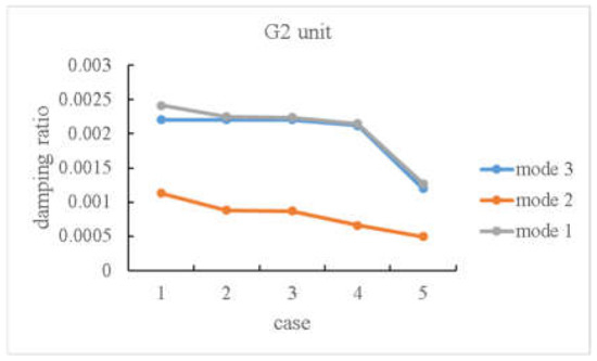 For the modal analysis, the damping ratios of G1 modes for the 5 cases are shown in Figure 22. The effects of various factors are superimposed. Firstly, the bad control parameter setting greatly reduces the damping ratios. Then the less wind farm power integrated and the single unit configuration make the damping ratios continue to decrease slightly. Finally, the generator de-rating operation greatly reduces the damping ratios once more. Furthermore, according to this figure, the degree of influence of various effects can be distinguished. The de-rating operation has the largest effect, the SSTI with onshore control comes next, the following is the machine configuration, and the amount of wind farm power integrated has the smallest effect.
