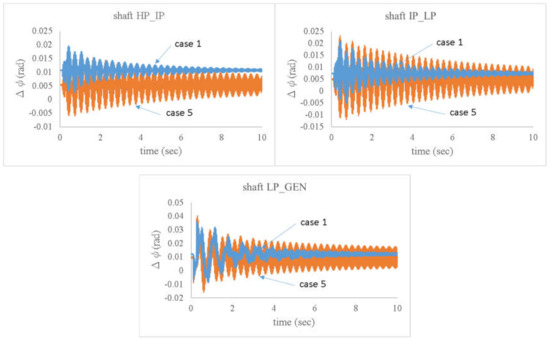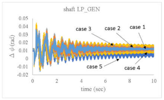 For the transient simulations, the shafts torsional responses for the five cases have been studied under the same events as previous. In order to compare the effects of the five cases, the torsional responses of shaft LPB_GEN for the five cases are shown in Figure 23. The effect of various cases layered on top of each other can be seen. Once again, it confirms that various effects have the characteristics of superposition on each other.