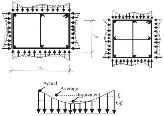 Based on their research studies, Saatcioglu and Razvi [] concluded that passive lateral pressure was not always uniform. Therefore, the above-mentioned model was built based on the equivalent uniform pressure calculation. Actually, the effect of this pressure is similar to non-uniform confinement pressures which are created in different columns. These columns may be strengthened in different orders and structures (Figure 1). The relation related to Ks calculation is as follows:
