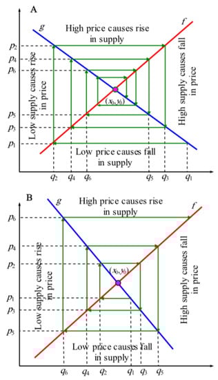 Based on the economic theory, within a given market, first, the commodity quantity (CQ) and commodity price (CP) may be exposed to various fluctuations; then, they may be progressively stable onto their corresponding points of equilibrium []. In general, this procedure is dependent upon both the producers’ supply relation and the consumers’ demand relation []. In a market economy, there is an economic theory which called the supply–demand mechanism (SDM) for determining the price. Based on this theory, the CQ in the next time qt + 1, with considering its current price pt. within a market is specified by taking into account the producers’ supply relation, that is qt + 1 = f(pt), where f stands for a linear supply function. In a given market, with the rise of the current CP, the CQ rises in supply at the next time []. With the rise in the commodity quantity, its price reduces; thus, g will be a reducing function. When oscillation occurs, the two functions will be intersected eventually at a certain point P(x0, y0), called the equilibrium point, where x0 and y0. Equation (9) expresses the supply function f [] as follows: