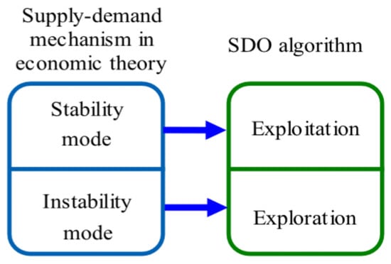Based on the SDM, the stability mode is capable of encouraging both the CP and CQ to exploit the equilibrium-point neighborhood, and such an exploitation process oscillates in magnitude over time. However, the instability mode typically forces both the CP and CQ to progressively find new areas positioned far from the point of equilibrium. The stability mode that is slowly reducing the oscillations in the SDM is able to be simply introduced to SDO as exploitation to carry out a local search within an encouraging area. Likewise, it is also possible to lend the instability mode to SDO as exploration in such a way as to carry out a search globally within the search space. Figure 3 demonstrates converting the SDM condition to the SDO algorithm. In case this solution outperforms the candidate solution, it will be used instead of the candidate one. It is worth mentioning that the method introduced in this study is actually an algorithm that works based on a swarm optimization; as a consequence, two matrixes are provided to present the CP and commodity quantity, respectively.