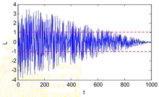 Figure 5 displays the values of the variable L over iterations, where T is fixed at 1000. As the figure demonstrates, in the initial iterations, the L values are L >1 or L < −1 with a high probability. With the rise of the iterations, such high probability starts to drop, and an increasing probability exists, indicating that the L function values are in the interval of [−1, 1]. In the following iterations, the L values are in the interval of [−1, 1] with an increasingly high probability. It is obvious that in the primary stage of iterations, SDO achieves high exploration and then switches smoothly to high exploitation.