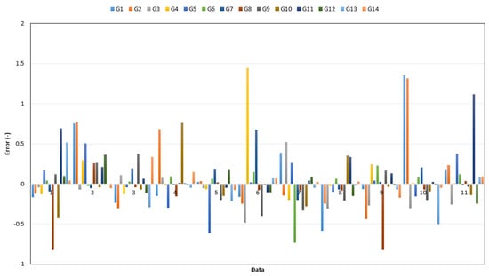 The input variables are the most important factor affecting the accuracy of a computing model. In order to predict Ks (model output) in the RC columns, six parameters were considered in the input layer of the neural network. Based on the experimental studies conducted in the past years [,,], the above mentioned six parameters were selected as the most important factors affecting Ks. The value variation range of these parameters is shown in Table 1. In order to compute the model, a total of 59 pieces of data were used, and their details are given in Table 1. The above mentioned 59 pieces of data (including Ks and the six parameters affecting them) were divided into two groups. Among them, the first 48 cases were considered for the training of the network (training data). The other ones, including the remaining data, were used to assess the neural network performance (testing data). In fact, 20% of the whole data, including 11 pieces of data that were selected randomly, were considered to test the model in each training stage. In order to investigate the pre-training of the main models, an analysis was implemented on different combinations of data to evaluate the Ks parameter. Table 2 shows the main combinations of these data for designing computational models. This analysis helps to investigate the effect of parameters on the model structure and its performance in predicting the Ks parameter at each stage. Figure 7 shows the results of this analysis in which the least error is related to the G14.