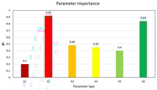 The effect of the parameters in determining the Ks is one of the most important parts of this area. In order to investigate the effect of each of the input parameters on the network output, the sensitivity analysis was used. The sensitivity analysis allows for making the network smaller by removing the less effective and unimportant inputs. Given that interactions are seen in the data, it is impossible to determine each effect in the ordinary way. Therefore, in this section, using the superior model of the previous step (SDO-ANFIS), the effect of these parameters on and their uncertainty that have a final result are discussed. Figure 17 shows the effect of 6 parameters on the Ks. As can be seen, these parameters are one of the most important indicators affecting the Ks, and different effects cause uncertainty in them. The best parameter that has the most impact on the Ks is the X2 () parameter while X1 (m) was the least effective parameter (0.2). In real conditions, the fyh (X5) parameter strongly affects Ks. However, as in this research only four different values of fyh, i.e., 500 MPa, 550 MPa, 900 MPa, and 1300 MPa, are considered to construct SDO-ANFIS, fyh showed a small effect. These parameters, because there are interdependencies between them, make it impossible to provide an accurate percentage. Therefore, the developed SDO-ANFIS model is used to check the uncertainty of the parameters. These results also show that due to the different uncertainties between the parameters, the best case should be determined based on important indicators.