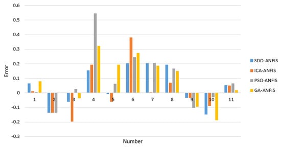 Finally, a comparison between the results of the testing data using the four hybrid models is presented in Figure 18. In this figure, the difference between actual and predicted data is given. According to this figure, in four of the models, the least error belonged to the SDO-ANFIS model. In addition, as can be seen, the difference between the actual and predictive data in the SDO-ANFIS model is a definite range, while in other models, the results are seen with more discrepancies. This confirms that the model developed in this research has a lower error rate and can predict the Ks parameter more reliably than other models.
